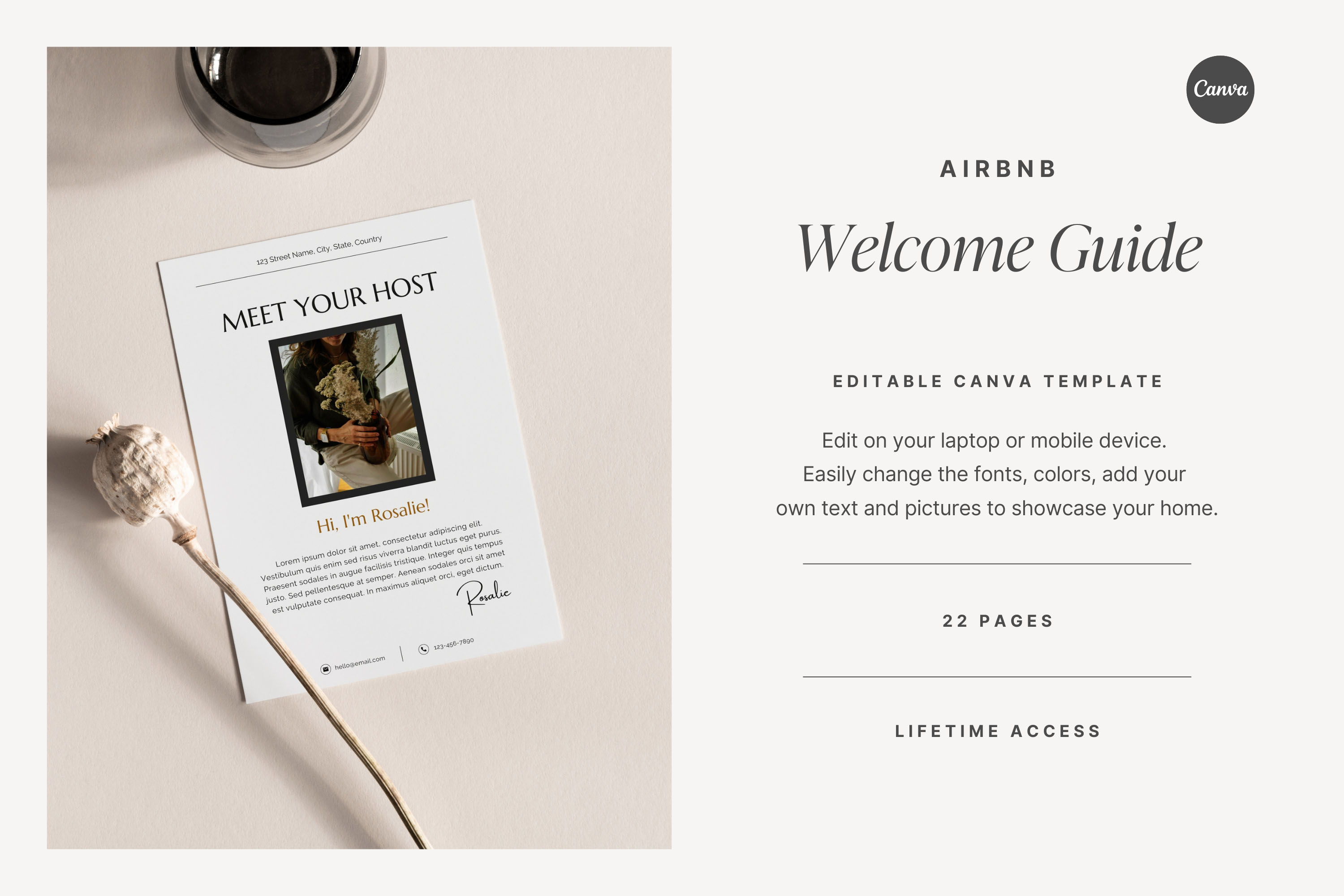 Introducing the ultimate Airbnb Guest Book—your secret to turning every stay into an unforgettable experience! For Airbnb hosts who want the best: our Airbnb Welcome Book template is your go-to toolkit for making your guests feel at home. No more stressing about what to include; our simple Guest Book for Vacation Rental takes the guesswork out of creating a warm and welcome book for your guests. No more Airbnb house rules headache: lay down the rules in a way that’s clear and friendly. Our Airbnb Guidebook template ensures that everyone is on the same page for a hassle-free stay. Get ready to host with heart!