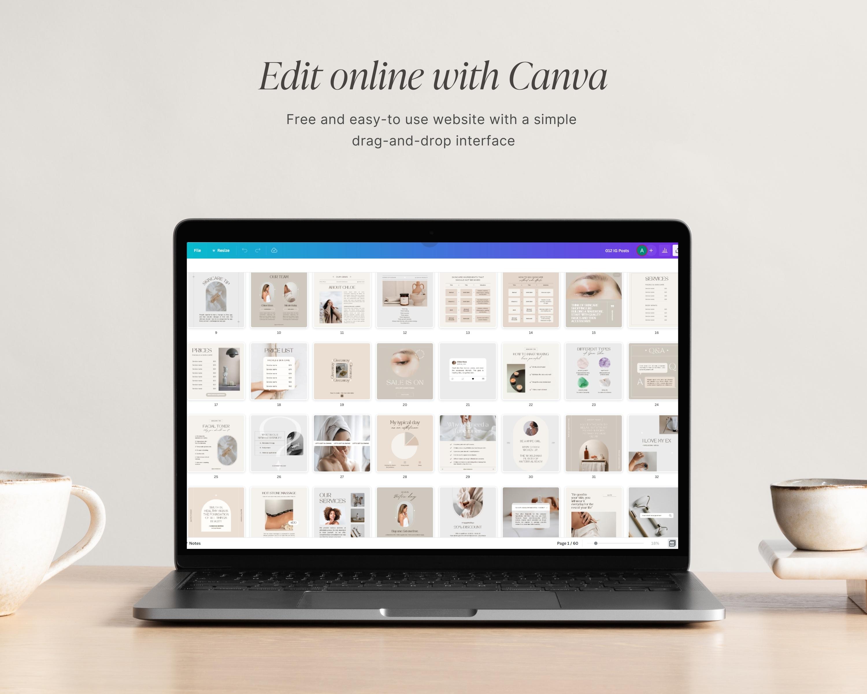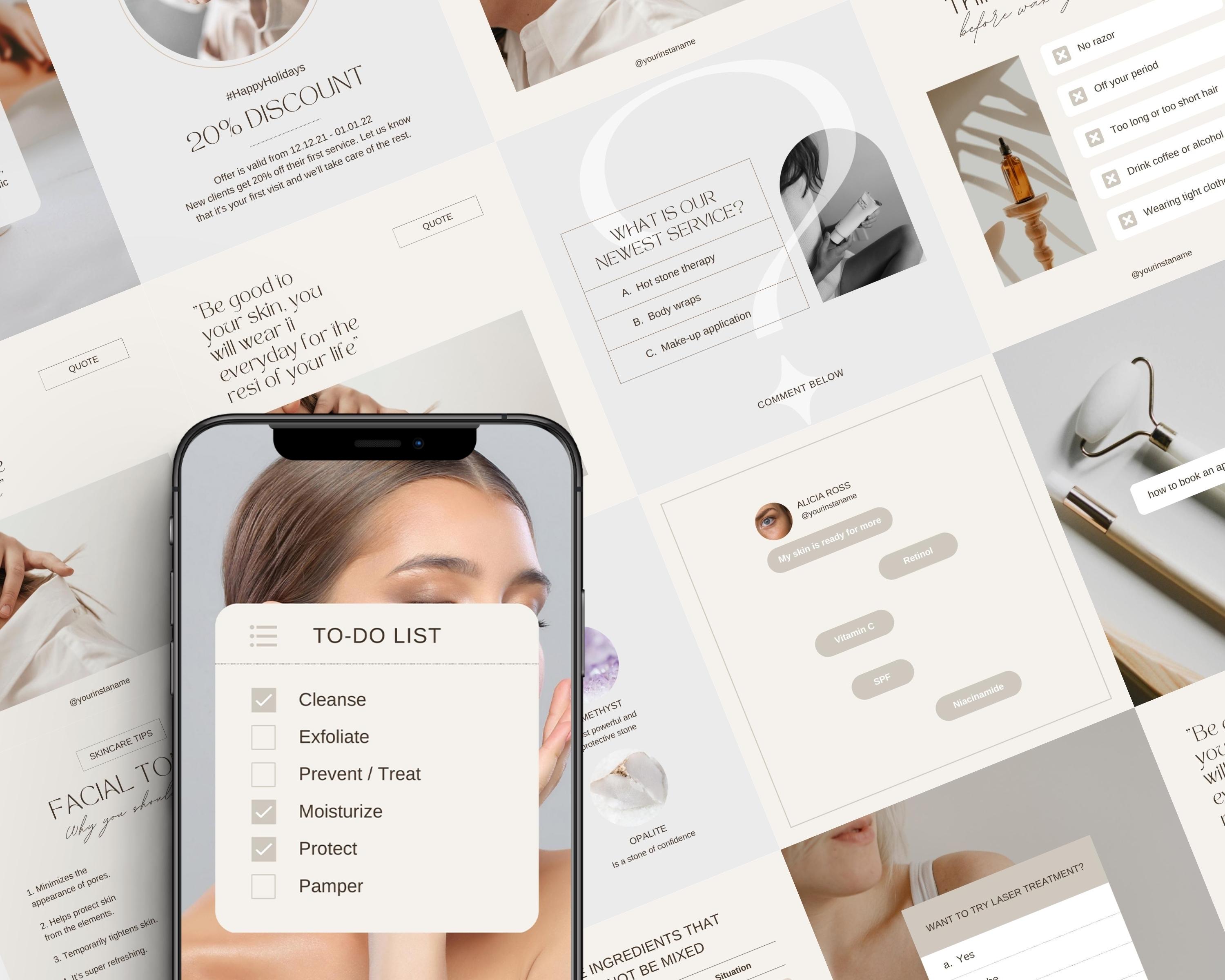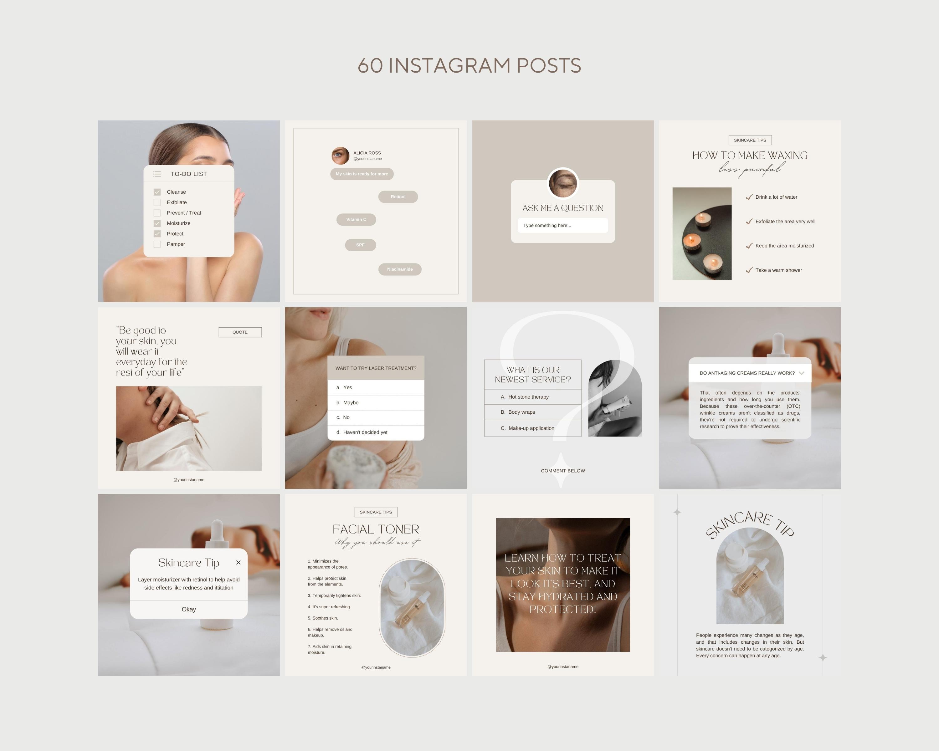 Looking for a content ideas for estheticians? Our curated collection of Esthetician Instagram templates is a game-changer! These editable Canva templates filled with content, designed specifically for your unique needs. You will receive 60 Esthetician templates that include various skincare quotes, beauty tips, product recommendations, and many more. Whether you are promoting your services, sharing skincare tips, or posting client testimonials, these beauty templates have you covered.
