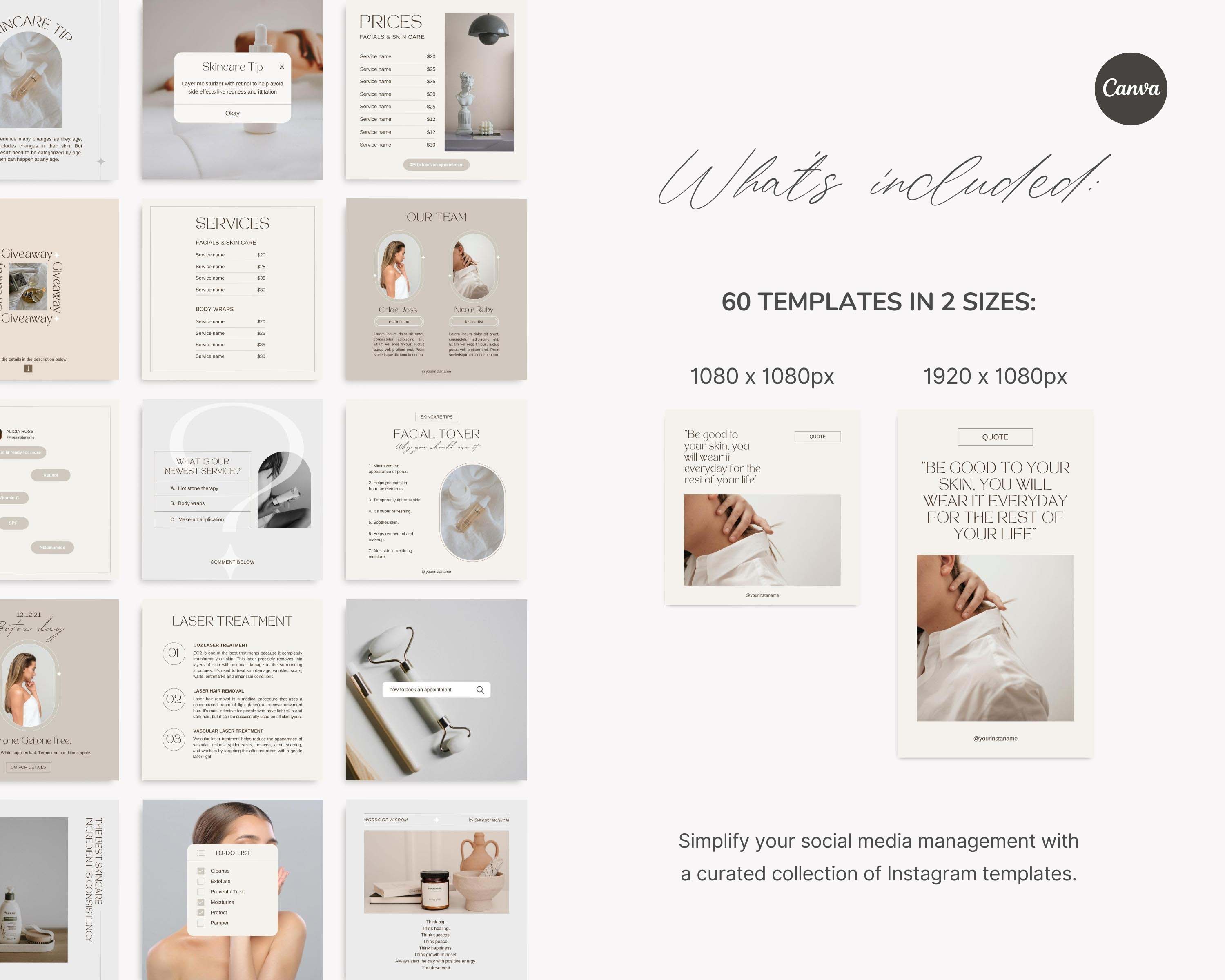 60 editable Instagram templates in 2 sizes: 1080x1080px and 1920x1080px