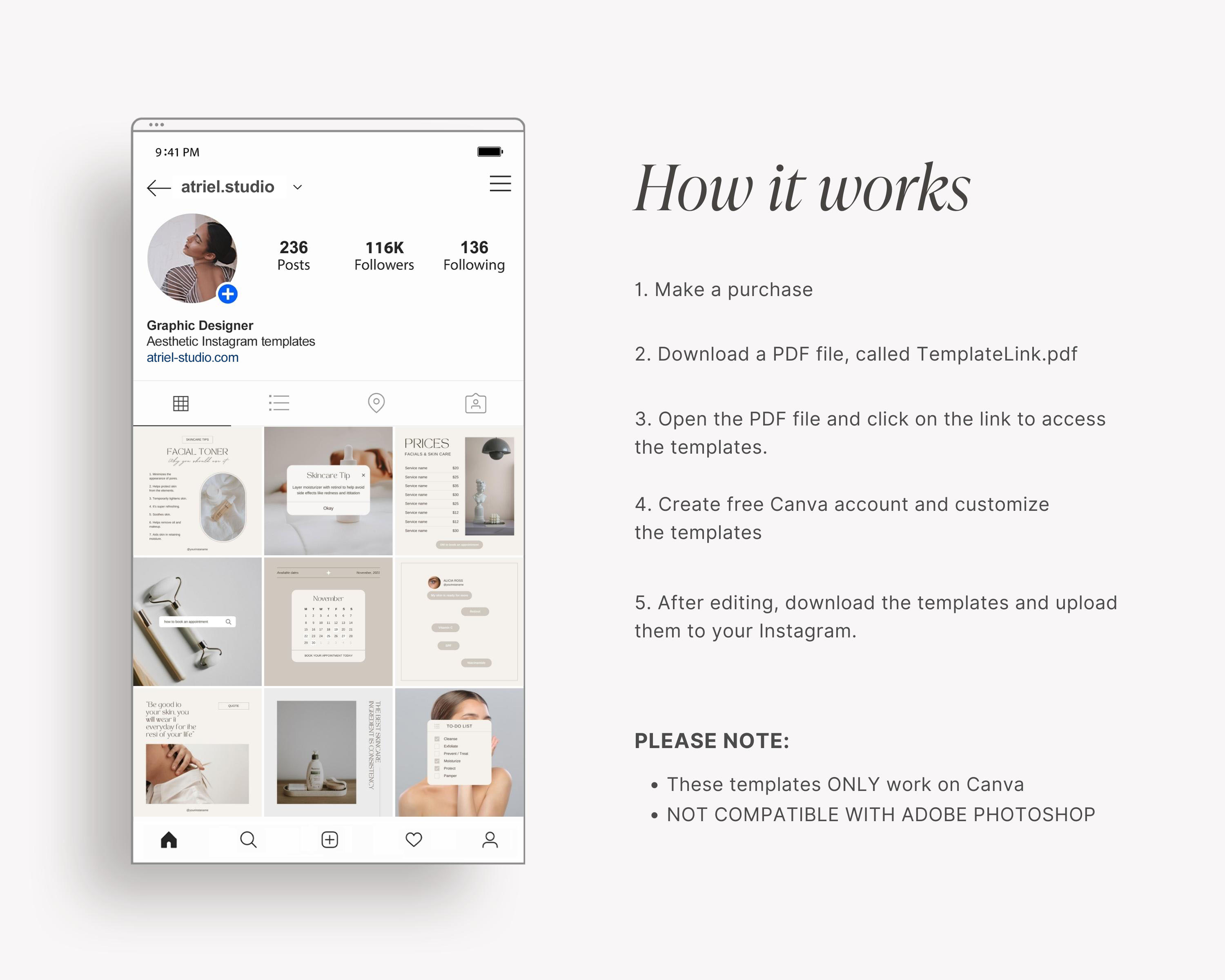 No design skills needed! Our user-friendly Instagram templates allow you to easily customize each element. Simply insert your photos, adjust colors to match your brand palette, add your unique text, and you’re ready to dazzle on Instagram!