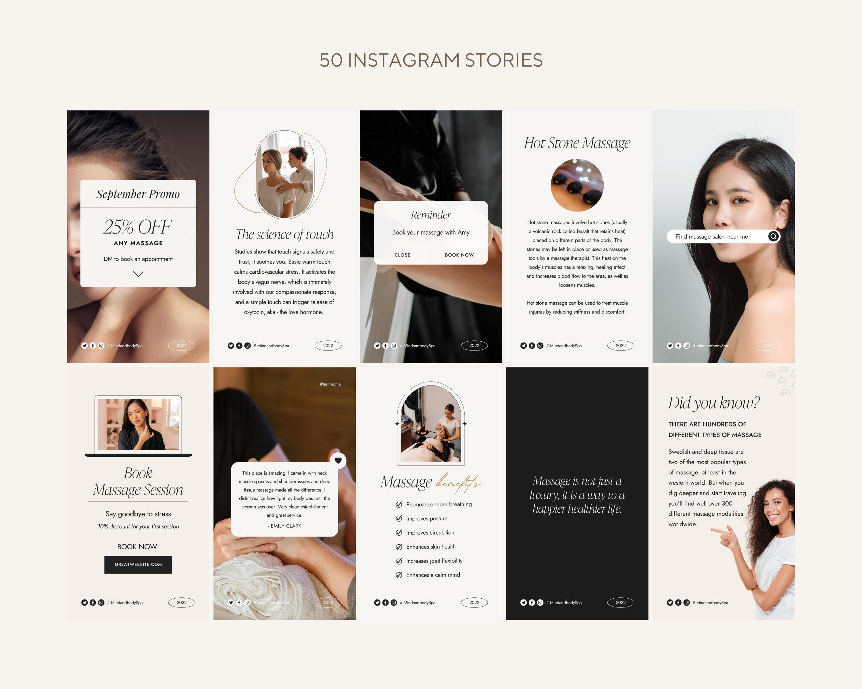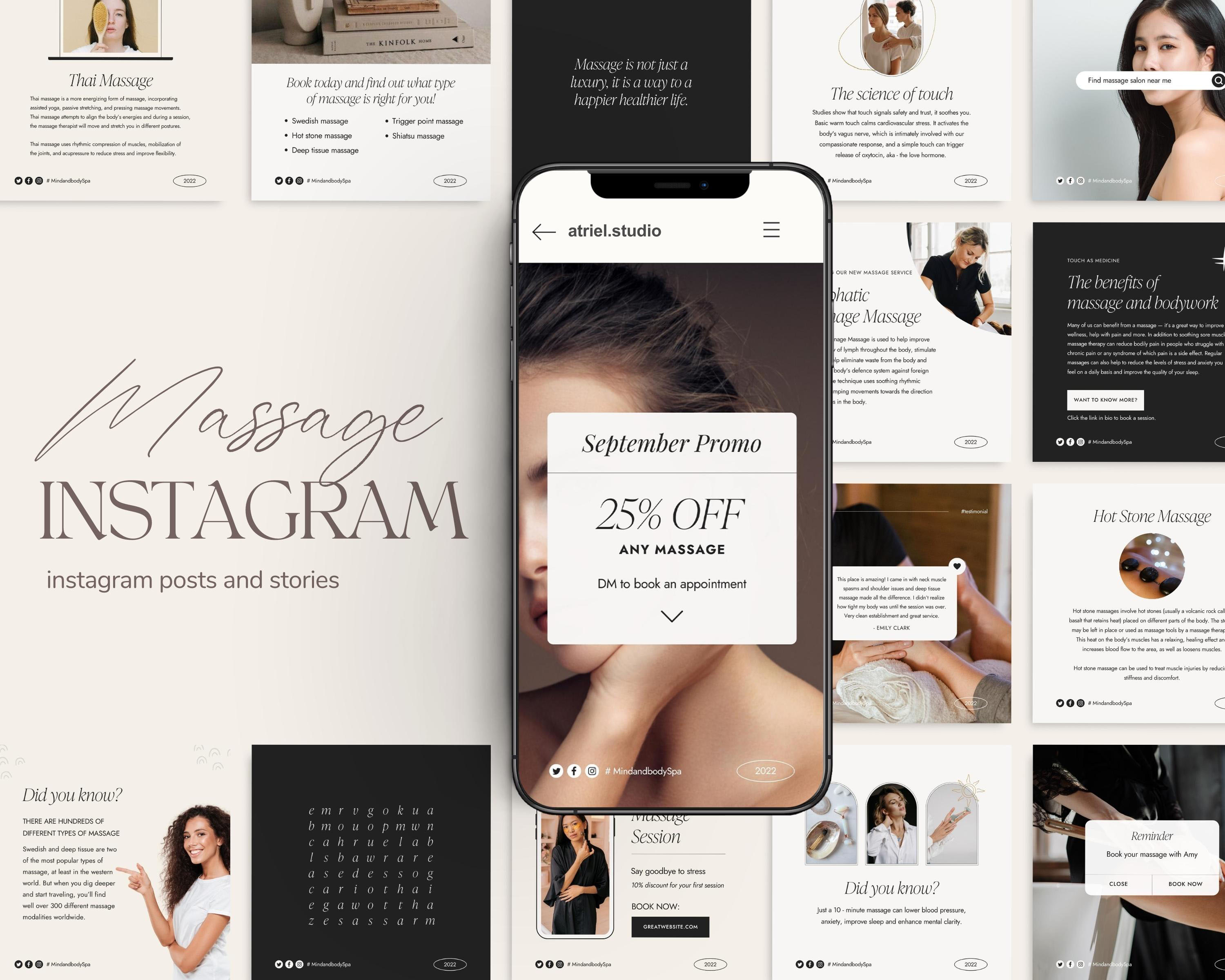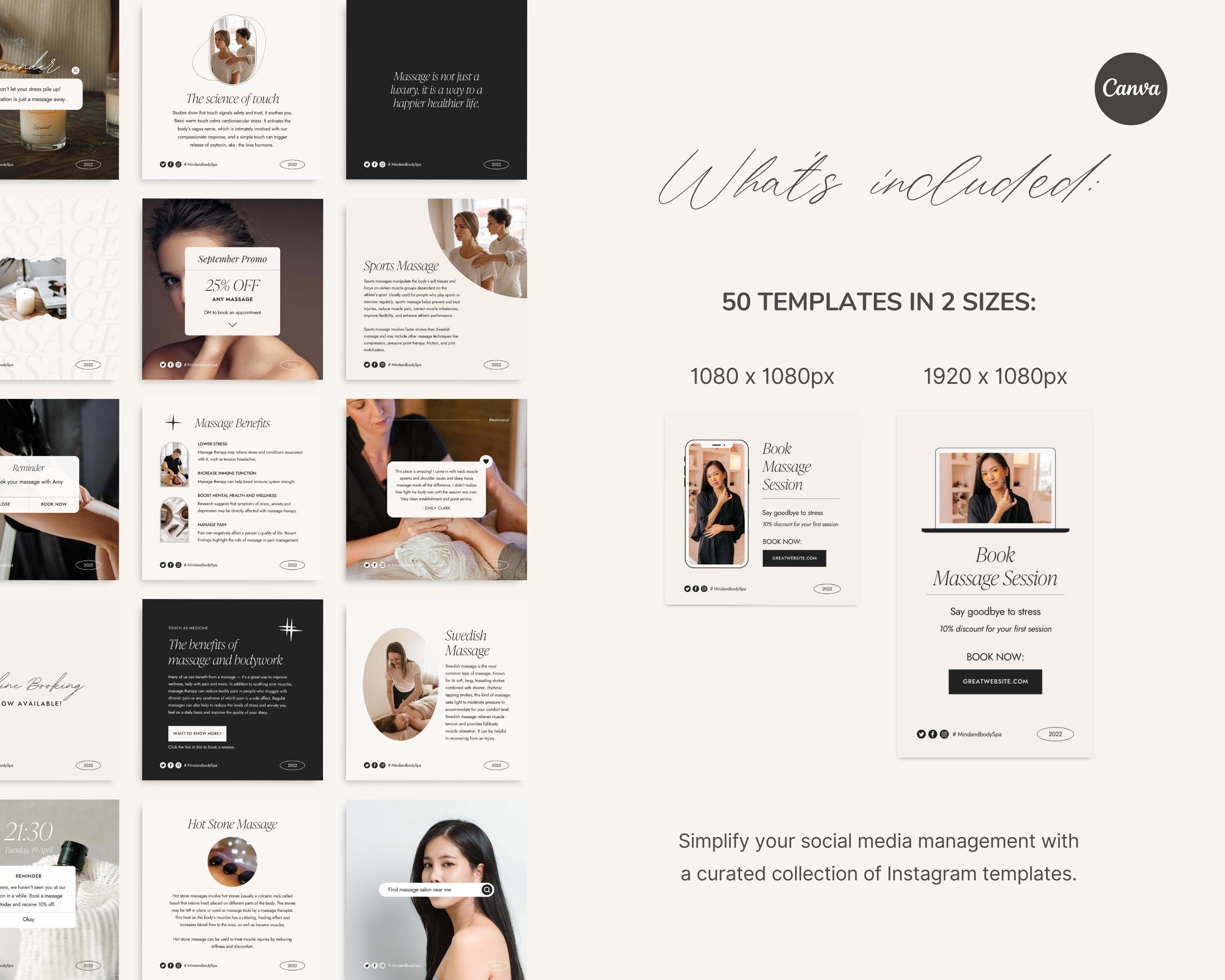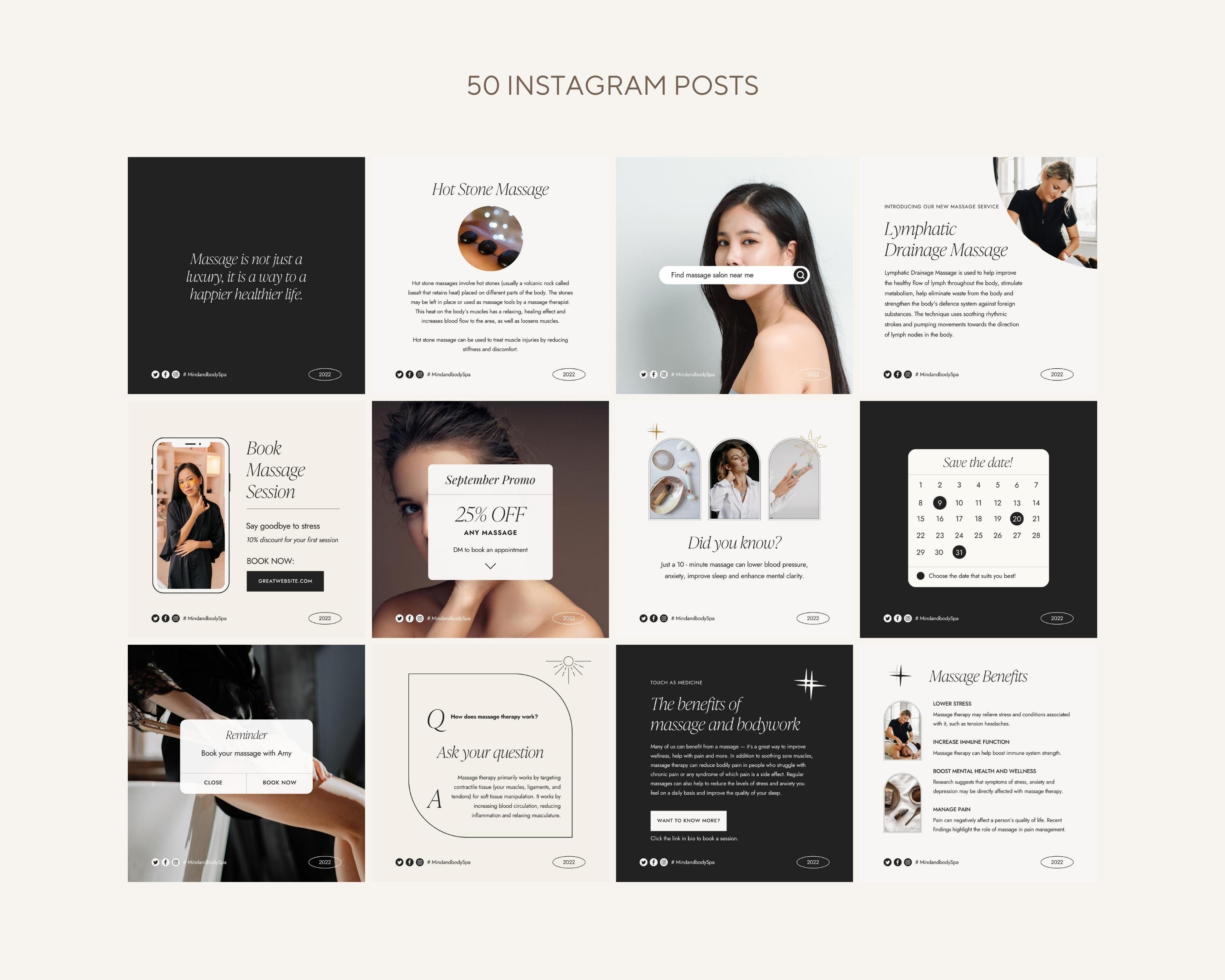 Introducing a collection of 50 Instagram Massage Posts curated exclusively for Massage Therapists. These editable massage templates include massage quotes, promotional banners, post massage care, bookings, client testimonials, self-care tips, and many more. Promote your massage services and invite your audience to embrace the luxury of self-care.