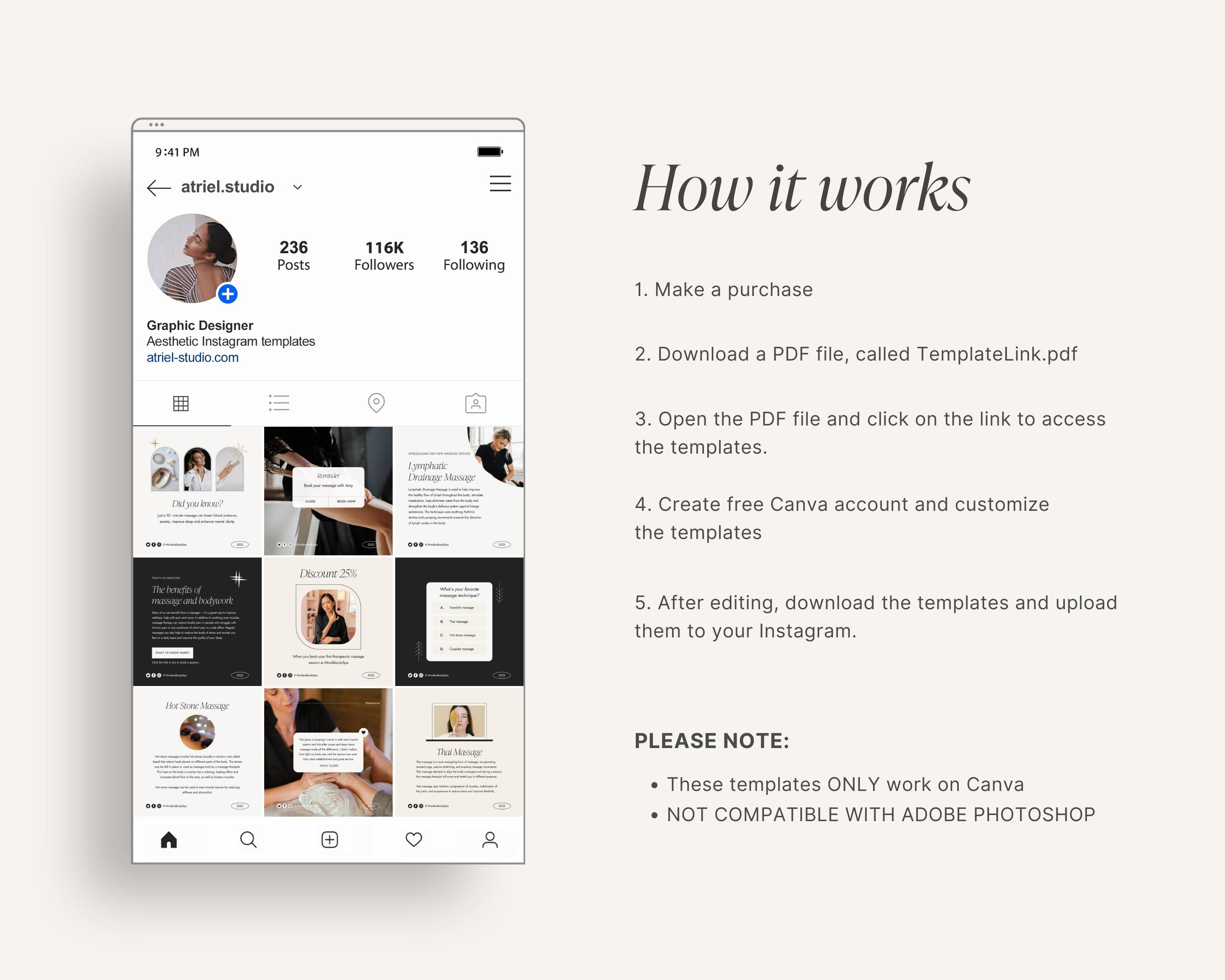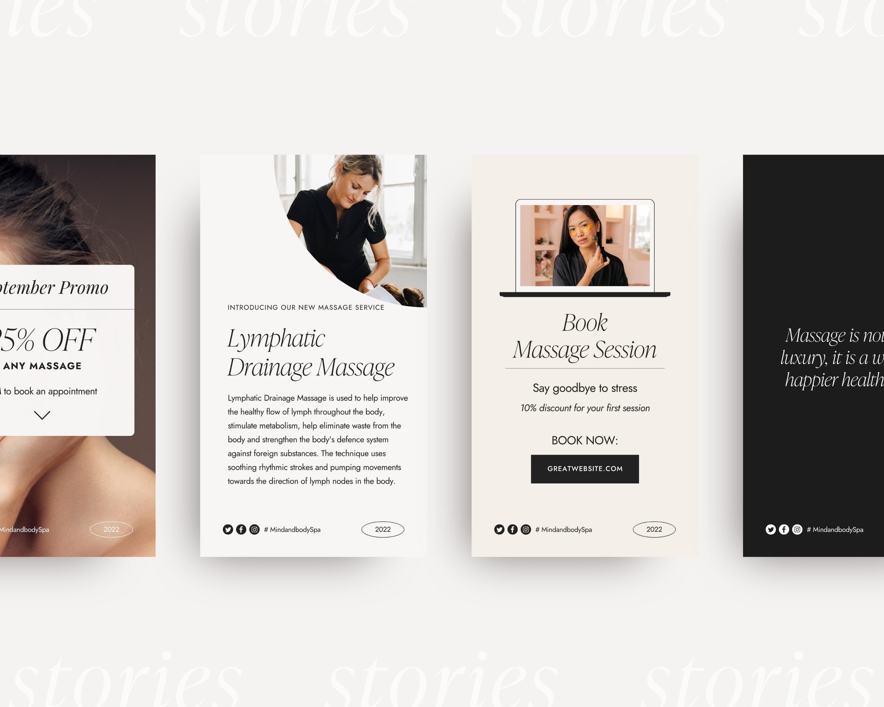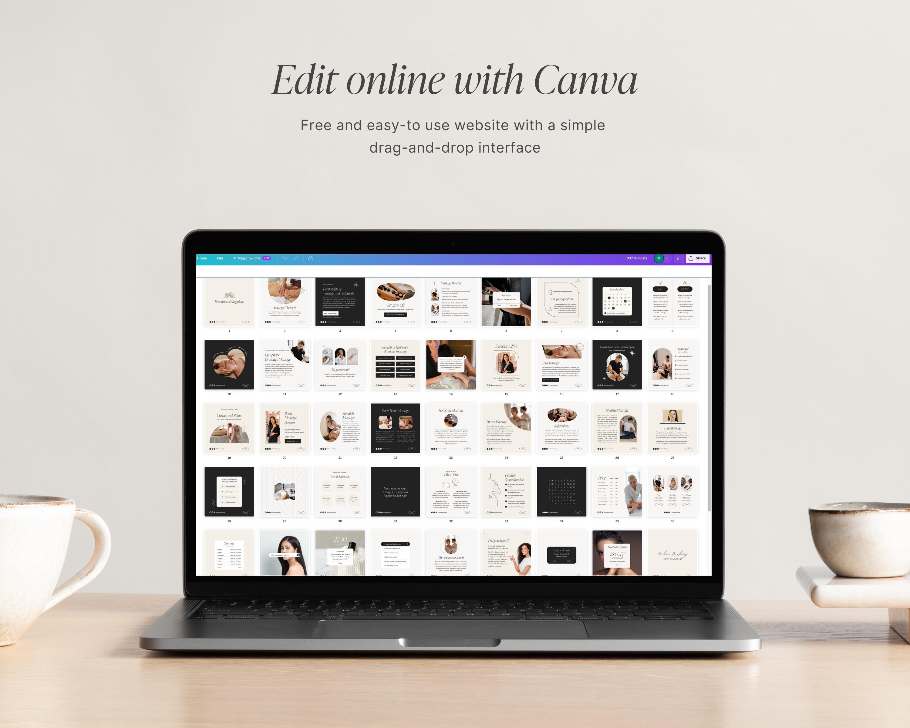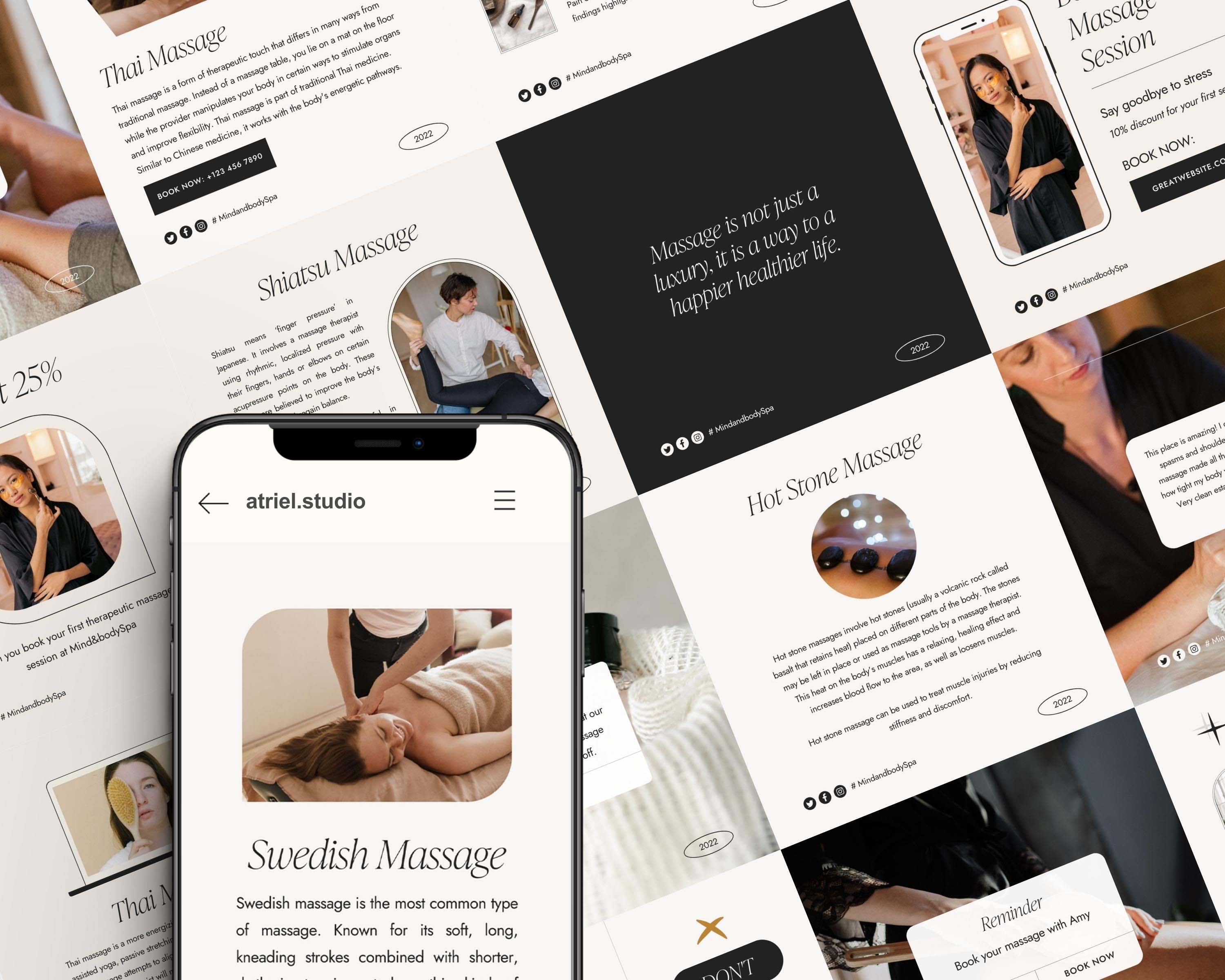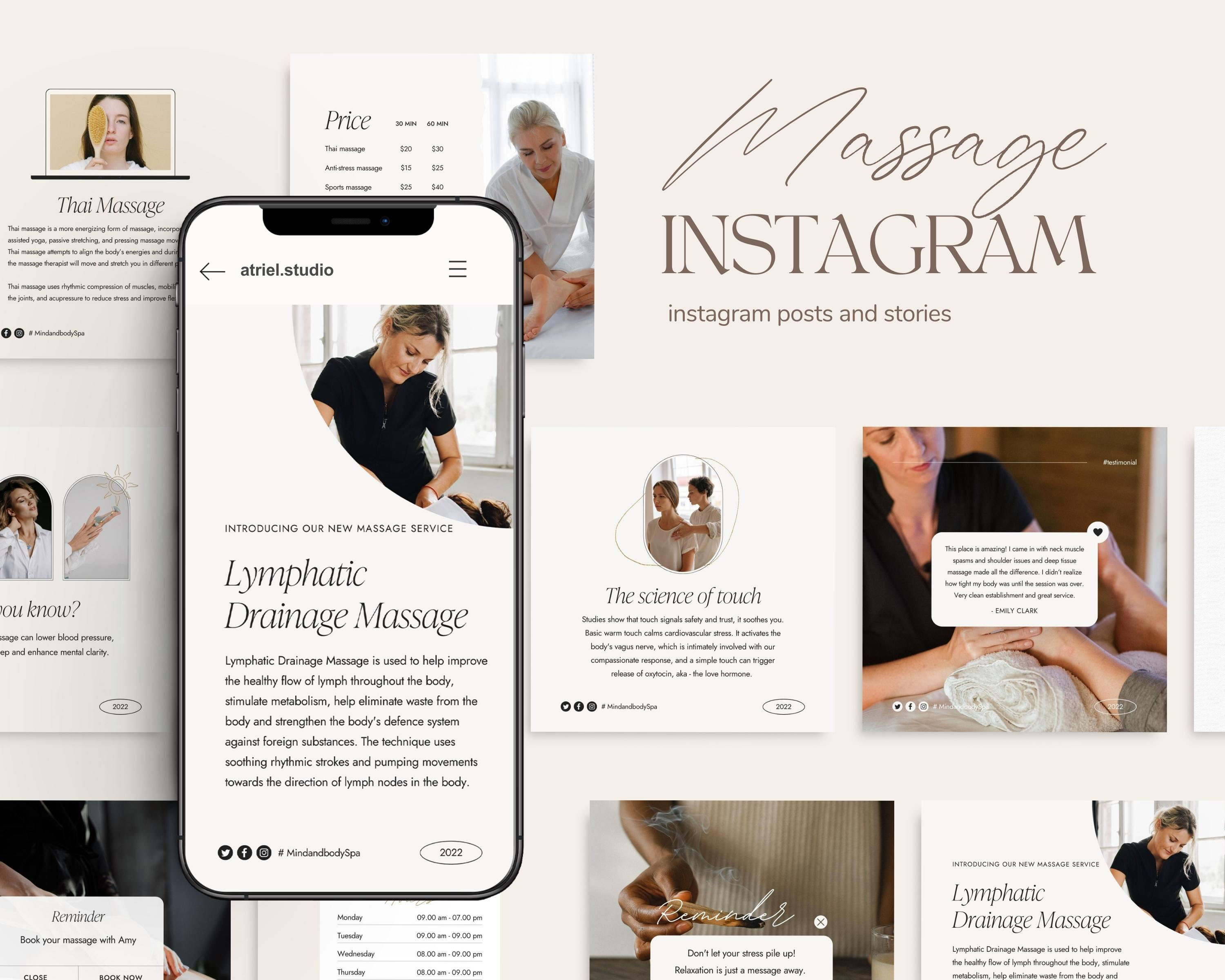 Introducing a collection of 50 Instagram Massage Posts curated exclusively for Massage Therapists. These editable massage templates include massage quotes, promotional banners, post massage care, bookings, client testimonials, self-care tips, and many more. Promote your massage services and invite your audience to embrace the luxury of self-care.