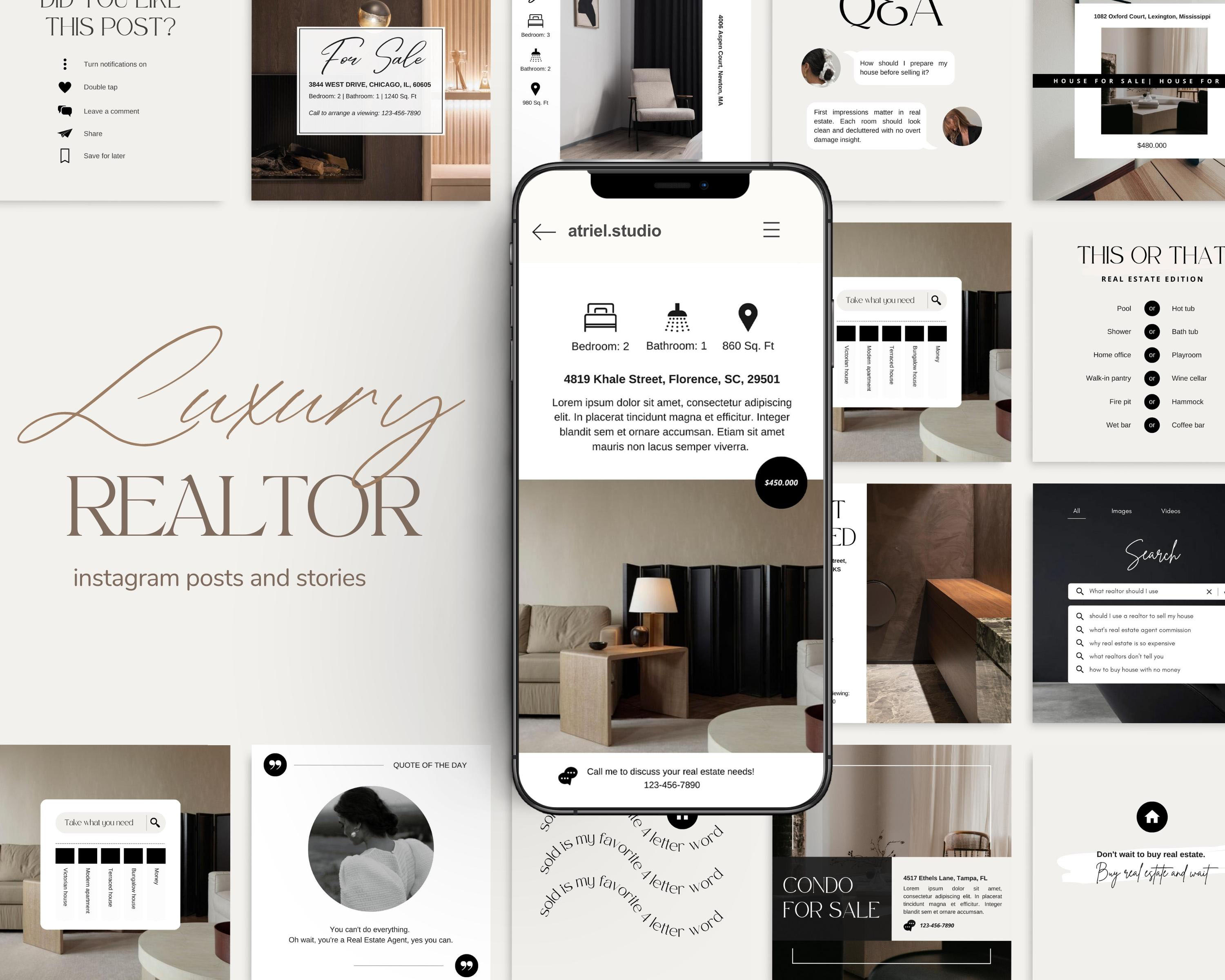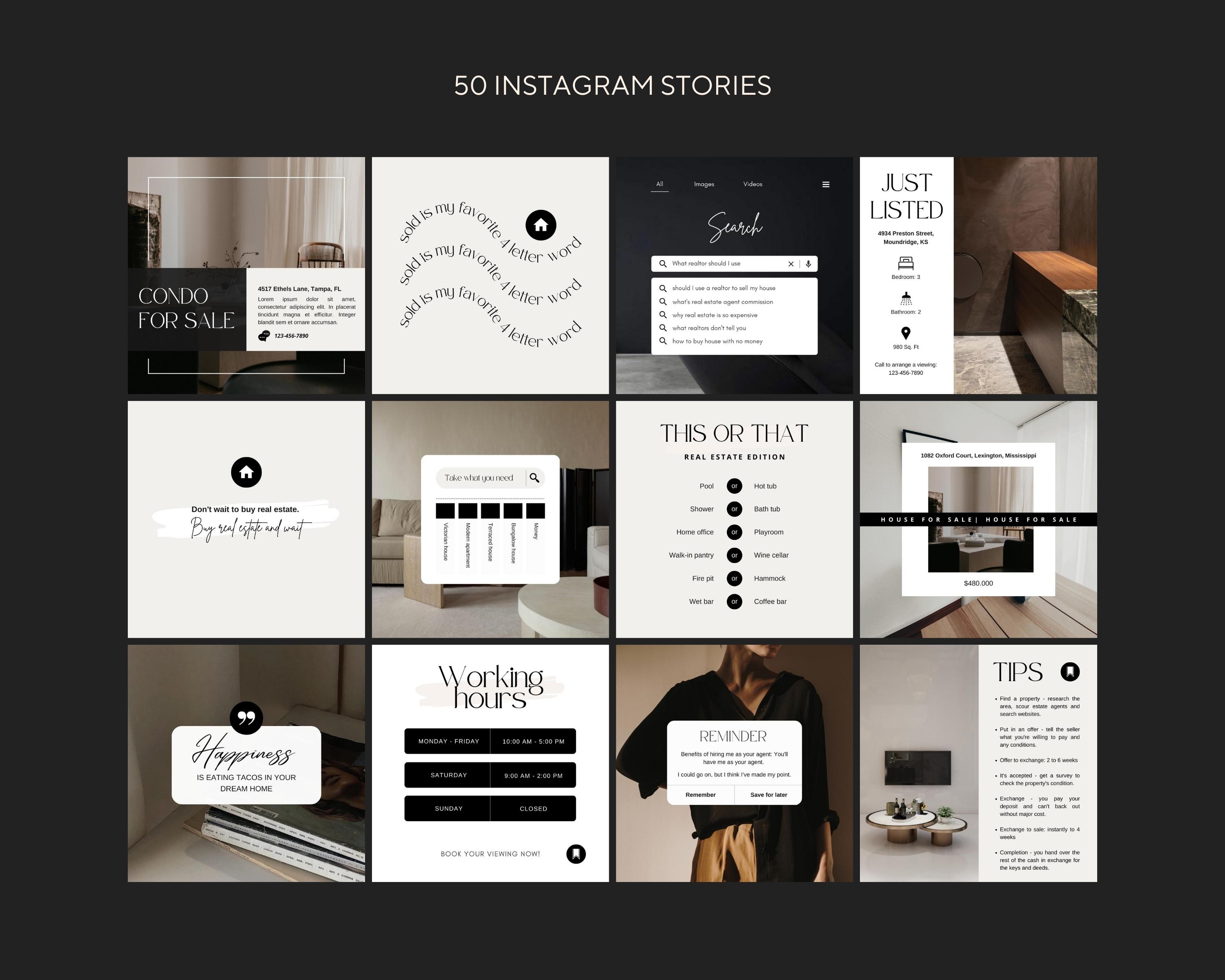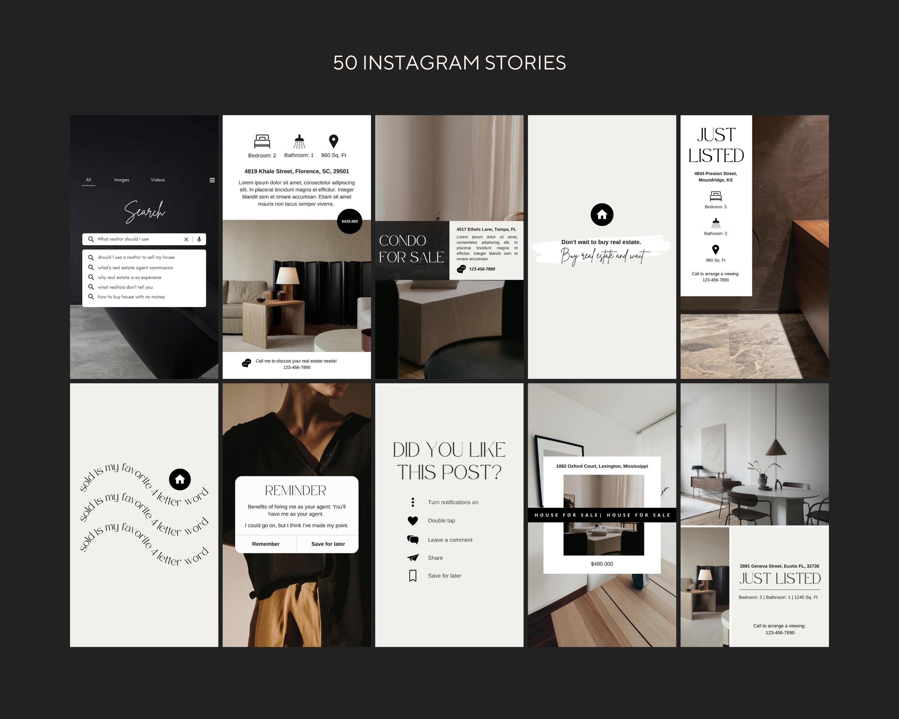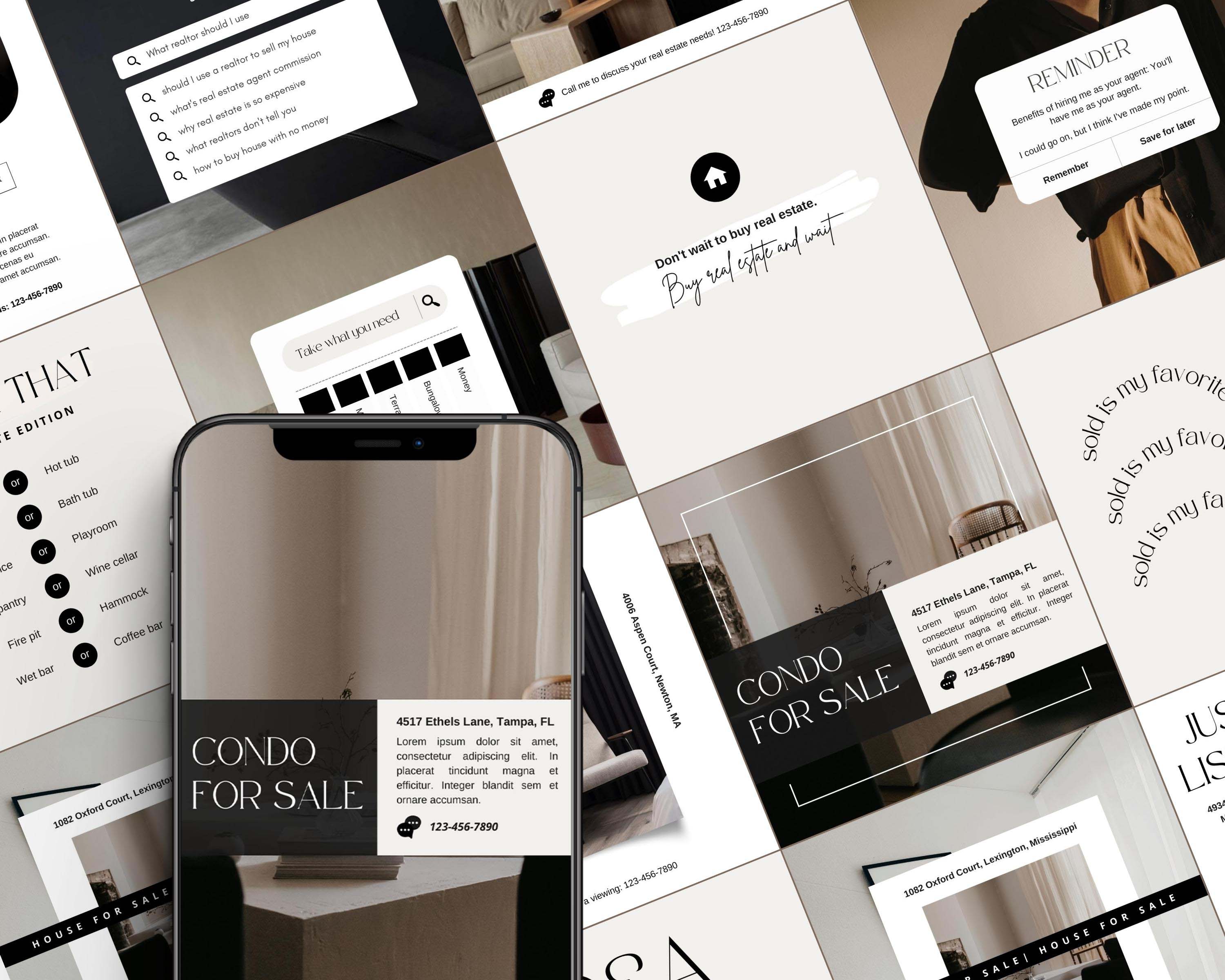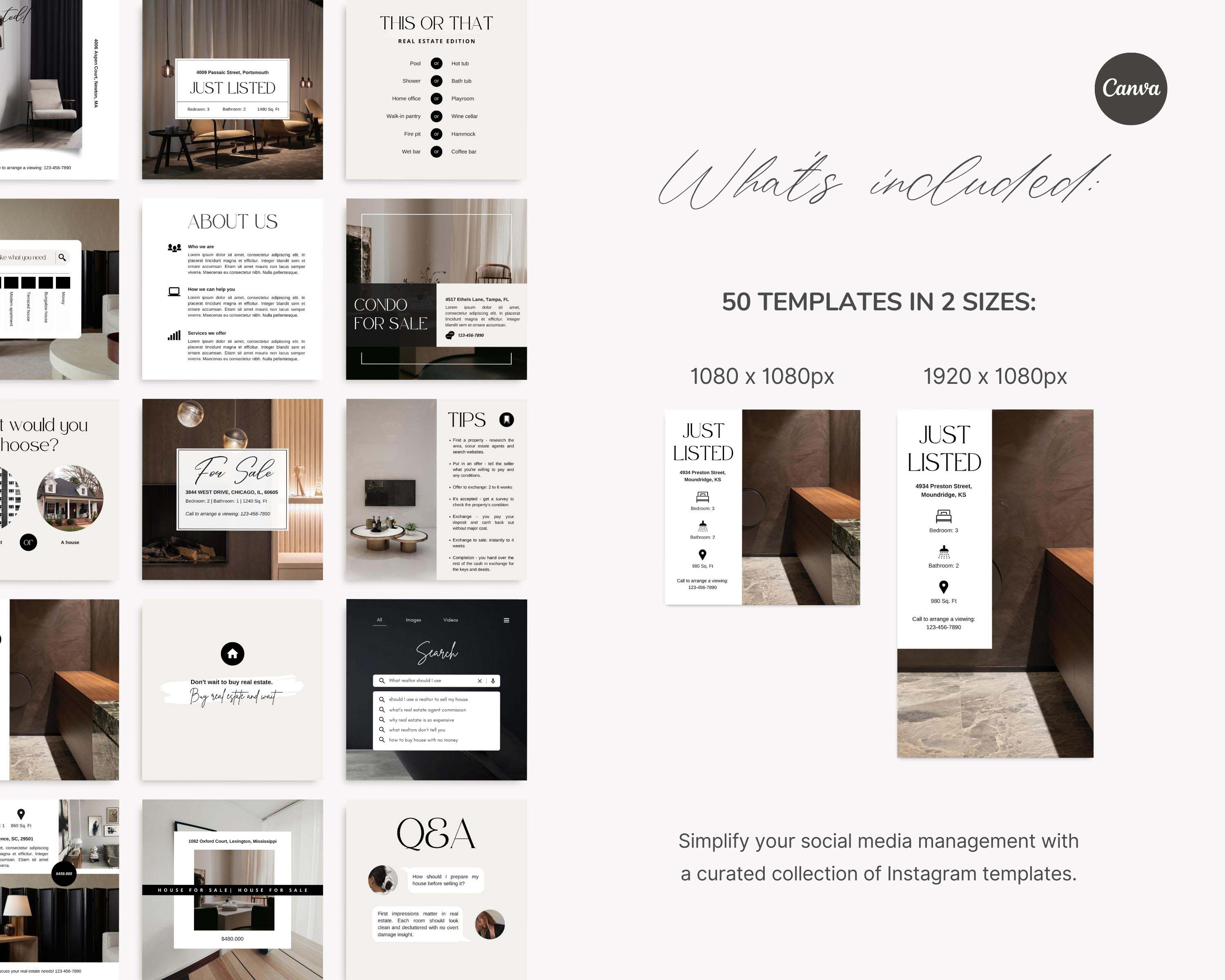 Looking for a Real Estate post ideas? Our curated collection of Real Estate Social Media Posts is a game-changer! These editable Canva templates for Real Estate filled with content, designed specifically for your unique needs. You will receive 50 Real Estate templates that include property photos, call to action, open house posts, testimonials, infographics, and many more. Let your properties shine and watch your audience grow with our premade realtor posts!
